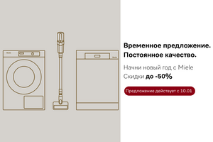 Читать подробнееMiele: Временные предложения. Неизменное качество. Скидки до -50% Настоящее качество зависит не от тенденций, а от долговечности, точности и стабильной производительности. В начале года Miele предлагает специальную подборку бытовой техники, доступной в рамках ликвидации стоков, со скидками до 50%, действующими в течение ограниченного периода времени.